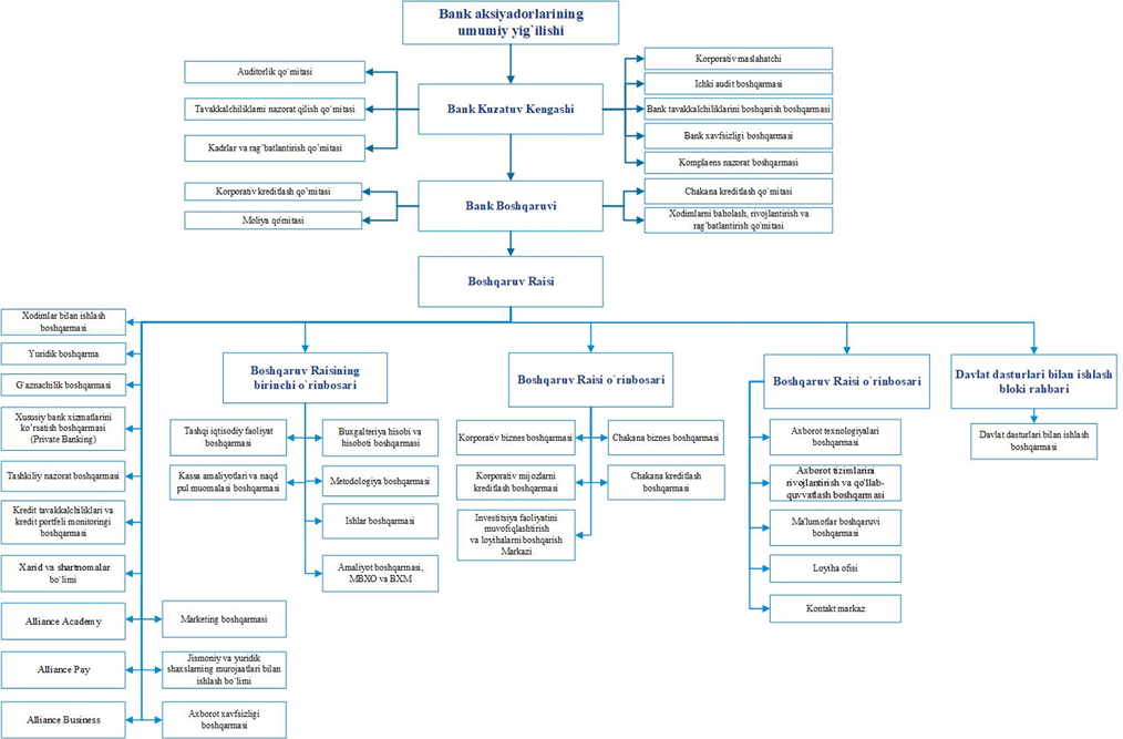 «Asia Alliance Bank» ATBning amaldagi tashkiliy tuzilishi 2023-yil 29-sentabrdagi Aksiyadorlar umumiy yig’ilishi qarori, 2025-yil 6-noyabrdagi Kuzatuv Kengashi qarori va 2025-yil 3-noyabrdagi Bank Boshqaruvi qarori bilan tasdiqlangan.